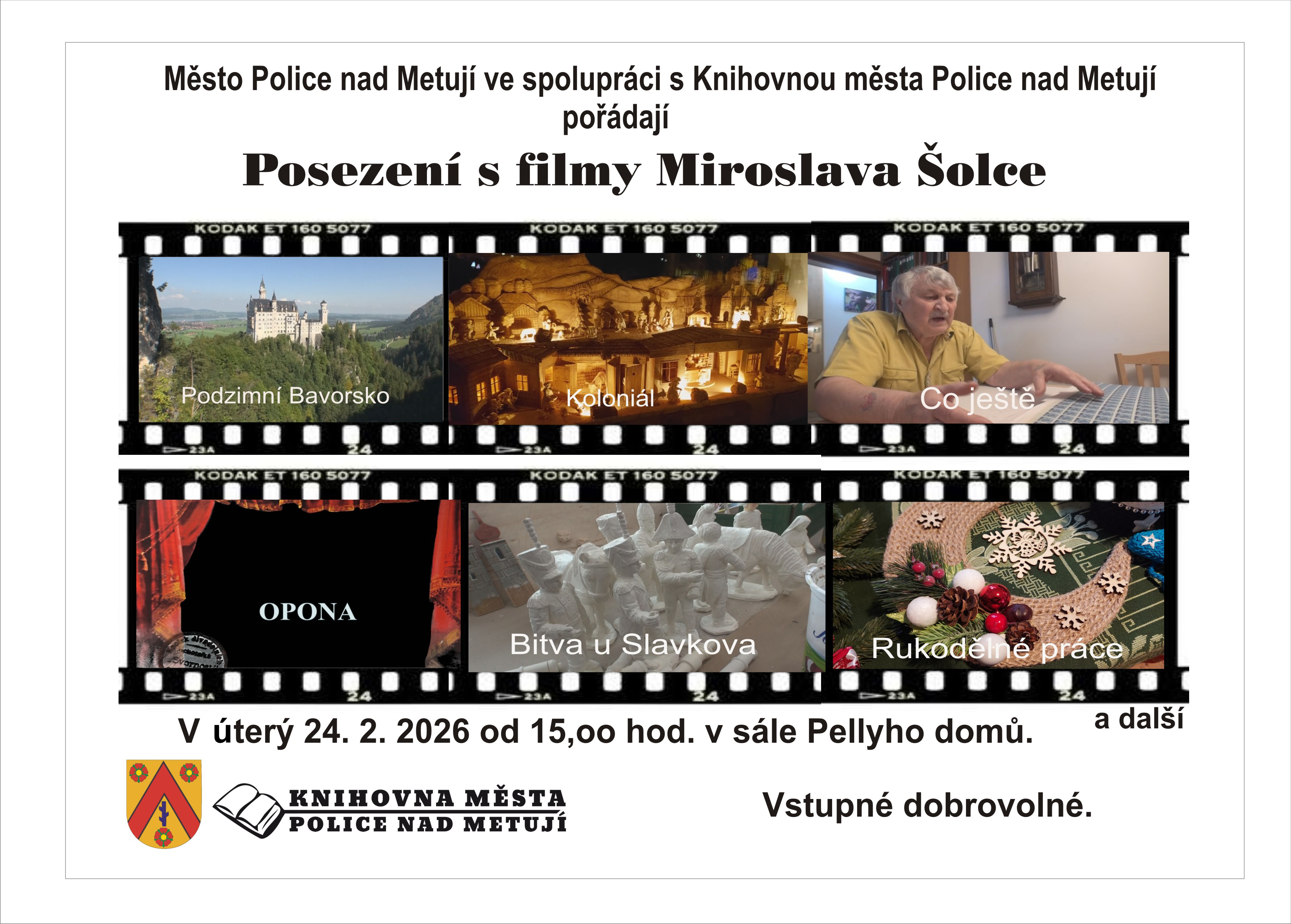 Město Police nad Metují ve spolupráci s Knihovnou města Police nad Metují pořádají - Posezení s filmy Miroslava Šolce.