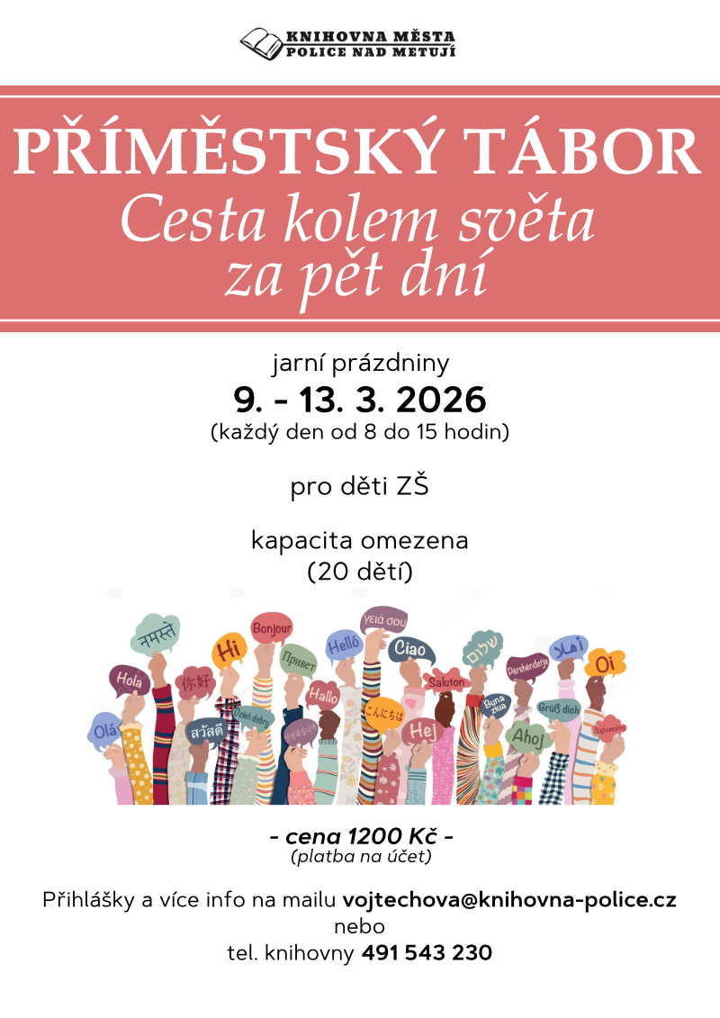Knihovna města Police nad Metují pořádá příměstský tábor - Cesta kolem světa za pět dní. Tábor proběhne v době jarních prázdnin od 9. - 13. března 2026 každý den od 8 - 15 hodin.